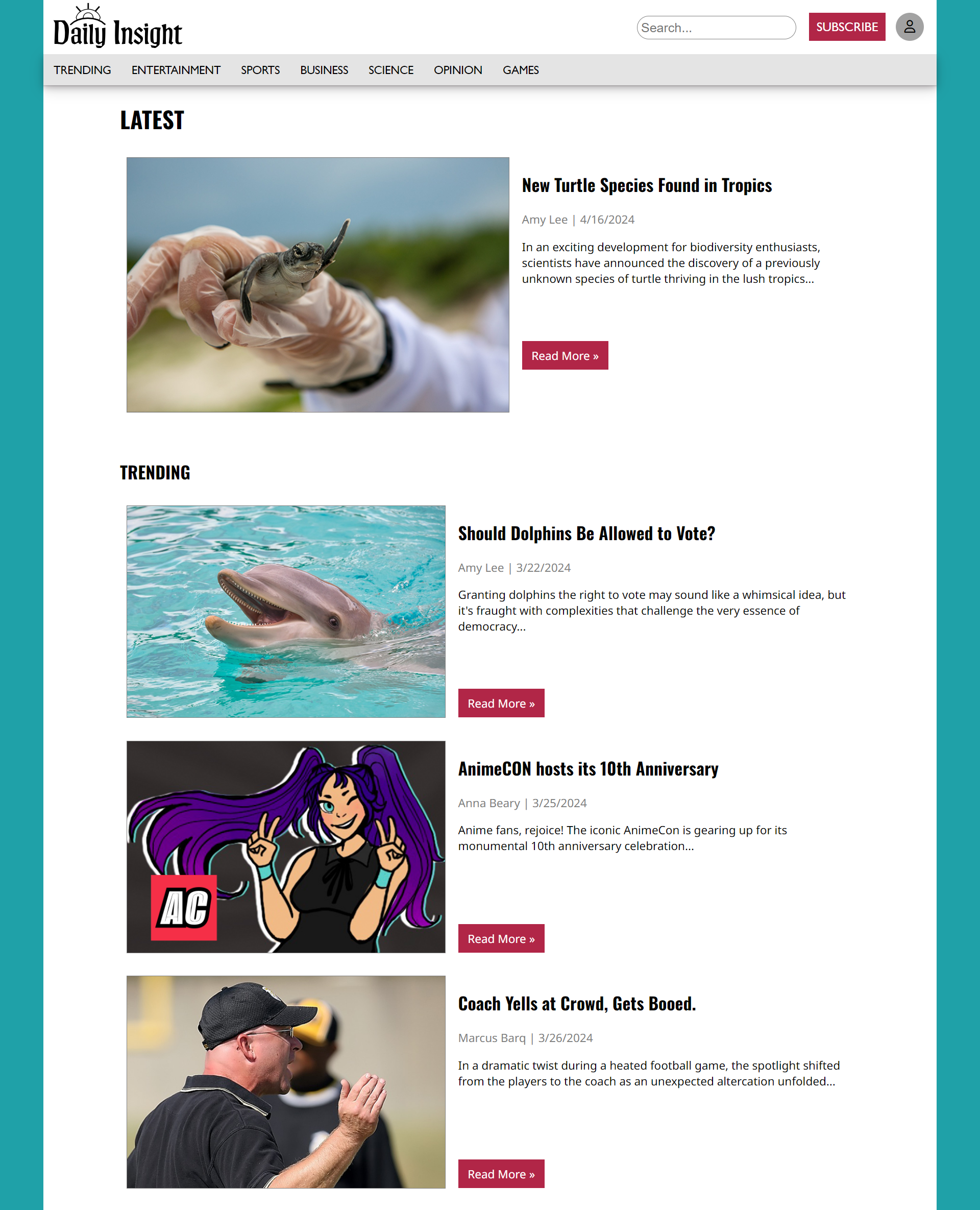 Created a website for a news organization. The site had to include multiple pages. The finished product has some interactive elements, including a responsive navigation bar with a dropdown menu, and support for mobile.